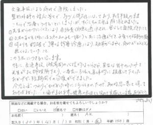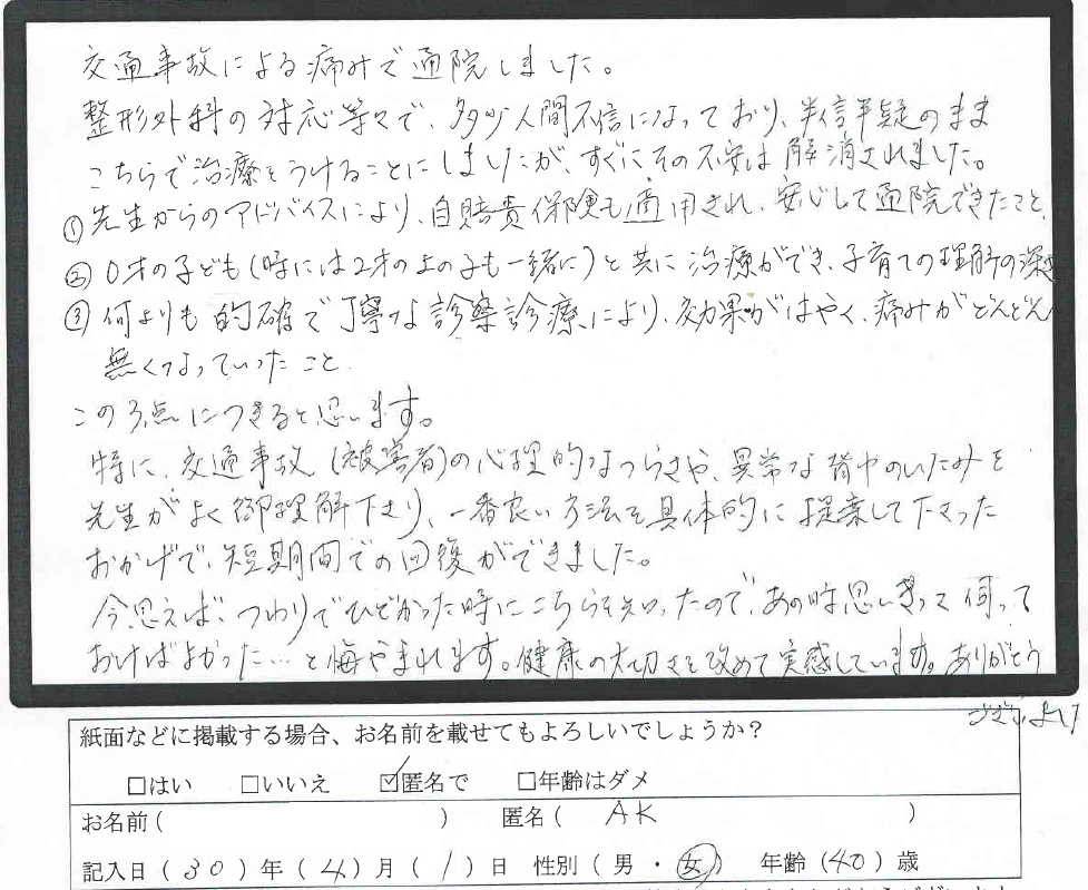 特に、交通事故(被害者)の心理的なつらさや異常な背中のいたみを先生がよく御理解下さり、一番良い方法を具体的に提案して下さったおかげで、短時間での回復ができました。