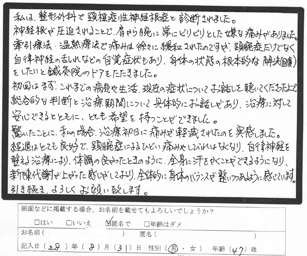 経過はとても良好で、頚腕症によるひどい痛みやしびれはなくなり、自律神経を整える施術により、体調の良かったときのように、全身に汗をかくことができるようになり、新陳代謝が上がった感じがしており、全体的に身体のバランスが整いつつあるように感じています。