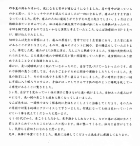 先日、無事に卒業となりました。親身に施術してくださった先生方に感謝しております。