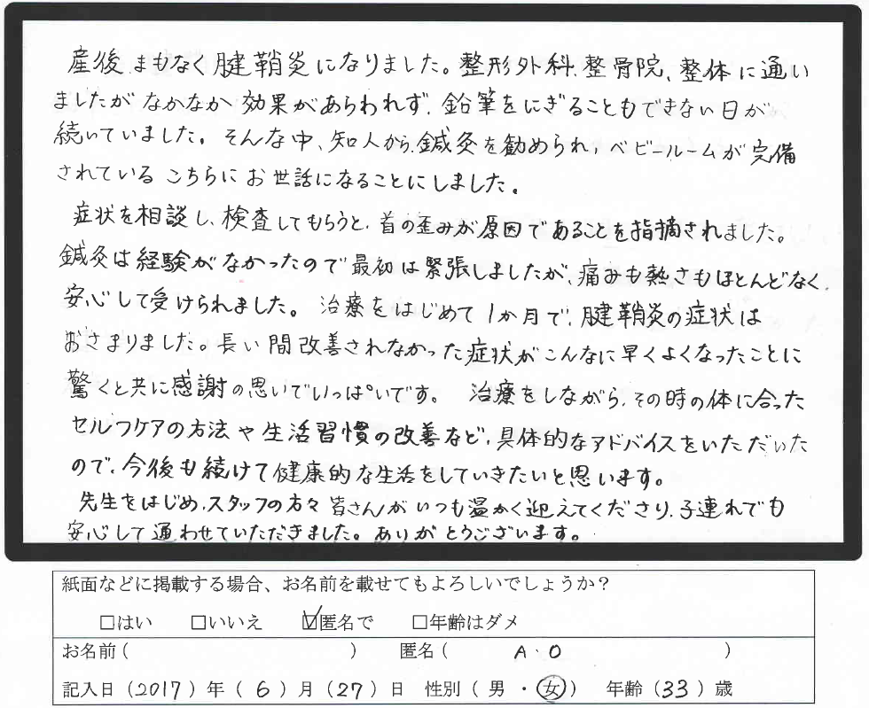 産後には腱鞘炎にもなってしまいましたが、鍼のおかげでだいぶ楽になりました。