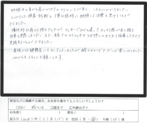 施術をしながら、その時の体に合ったセルフケアの方法や生活習慣の改善など具体的なアドバイスをいただいたので今後も続けて健康的な生活をしていきたいと思います。