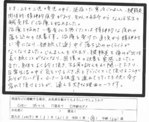 長い間改善されなかった症状がこんなに早く良くなったことに驚くと共に感謝の思いでいっぱいです。