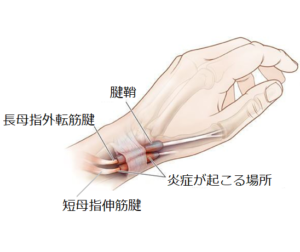 ドゥケルバン病は右の図にある、長母指外転筋腱と短母指伸筋腱が腱鞘で狭窄(中が狭くなる)されるために起こる症状です。