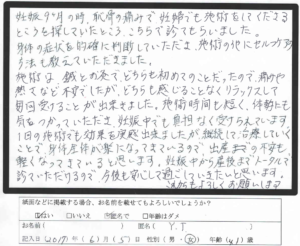 1回の施術でも効果を実感出来ましたが、継続して施術していくことで、身体全体が楽になってきているので、出産の不安も軽くなってきていると思います。