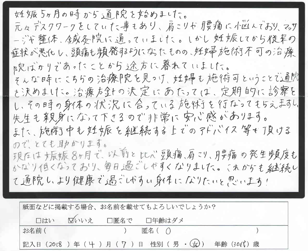 現在は妊娠8ヶ月で、以前と比べ頭痛、肩こり、腰痛の発生頻度もかなり低くなっており、毎日過ごしやすくなりました。これからも継続して通院し、より健康的で過ごしやすい身体になりたいと思います。